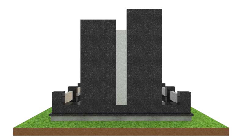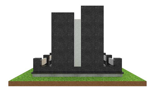 Центральную часть композиции составляют две вертикальные стелы строгой прямоугольной формы. Между памятниками добавлена вертикальная вставка из светлого Мансуровского гранита. Она создает выразительный контраст с черным камнем и визуально разделяет памятные плиты.: