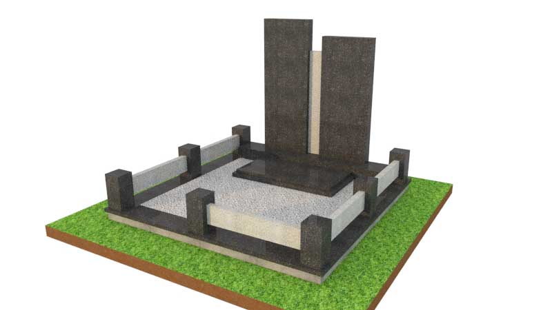 Участок обрамлен низким бордюром из гранитных блоков контрастных цветов, Чередуются черные полированные прямоугольные столбы из габбро-диабаза и светлые балки из мансуровского гранита. Бордюр создает четкую геометрическую границу, придавая мемориалу лаконичный и строгий вид. Вся внутренняя территория участка засыпана светлым гранитным щебнем. Это создает аккуратное декоративное покрытие, которое не требует постоянного ухода, в отличие от живых растений.