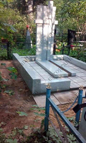 Мемориальный комплекс из светлого мансуровского гранита под артикулом МК-11 имеет интересное исполнение. Стела выполнена в форме высокого вертикального прямоугольника, пересеченного каменным крестом. В подножии стелы словно отпечатался её оттиск, символизируя невидимую грань между миром живых и мертвых. Комплекс включает каменный цоколь, внутри которого уложена тротуарная плитка. Все элементы выполнены из мансуровского гранита, благодаря чему композиция выглядит единым целым.