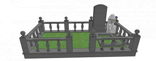 Большой мемориальный гранитный комплекс из габбро-диабаза (артикул МК-13 в соответствующем разделе) предназначен для оформления мест одиночных или семейных захоронений на участках, превышающих стандартный размер. Комплекс включает бетонный цоколь с полной облицовкой, сверху гранитная ограда с входом по центру, выполненная полностью из Габбро-Диабаза и состоящая из гранитных балясин, перил и 8-ми столбиков, сверху украшенных небольшими гранитными шарами. Фигурная вертикальная стела выполнена полностью из чёрного гранита с цветником. Возле стелы установлена художественная скульптура – скорбящий ангел.