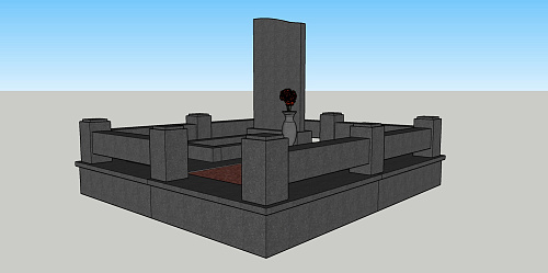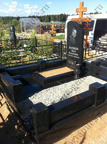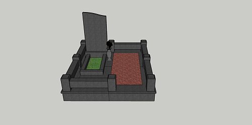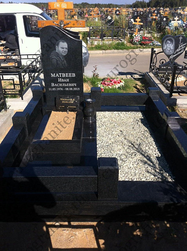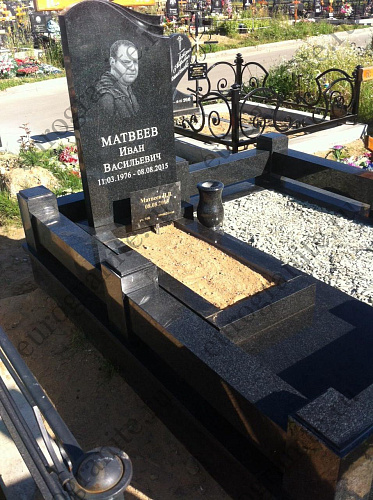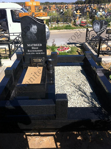 Мемориальный гранитный комплекс из габбро-диабаза под артикулом МК-19 включает одну стелу-памятник для усопшего, при этом вторая половина предусмотрена для захоронения на ней еще одной могилы, которая засыпается мраморной крошкой. Кроме памятника в стоимость мемориала включаются бетонный полумонолитный цоколь с полной облицовкой гранитными плитами, цветник с грунтом под живую клумбу, гранитный цоколь в качестве ограждения с восьмью столбиками и входом посередине, ваза из гранита.