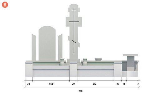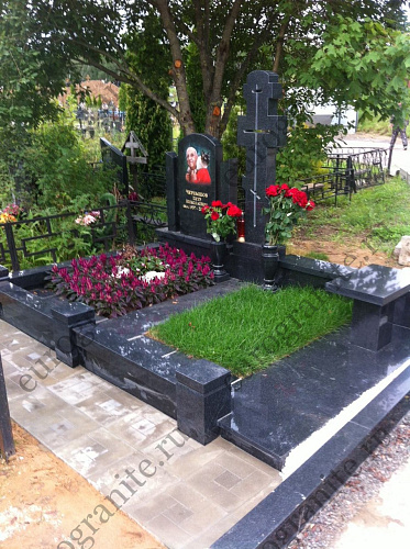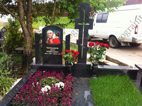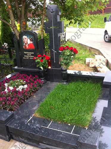 При производстве мемориального комплекса под артикулом МК-25 был использован гранит габбро-диабаз. Такой мемориал был установлен в 2018 году на одном из кладбищ Москвы (Вешки). Комплекс идеально подходит для мест семейных захоронений, поскольку проект предполагает размещение двух могильных стел. Устанавливается комплекс на ленточном бетонном фундаменте с полной облицовкой. В качестве подставок для стел выступает одна из сторон цоколя, а в качестве разделителя между устанавливаемой в будущем второй стелой выступает православный гранитный крест. Портрет выполнен с помощью метода художественной гравировки и раскрашен специальной краской по граниту, а надписи сделаны с помощью глубокой ручной гравировки и покрыты сусальным золотом. Стоимость мемориала зависит от комплектации, цену на день обращения уточняйте у менеджера.