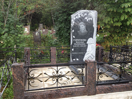 Мемориальный комплекс под артикулом МК-36 с художественно оформленной гранитной стелой из габбро-диабаза, на которой высечена береза и скорбящая женщина, мастерская «Еврогранит» изготавливала для Мамоновского кладбища Москвы. Могила обустроена гранитным цоколем из дымовского гранита с кованой оградой, установленным на ленточном бетонном основании без облицовки.