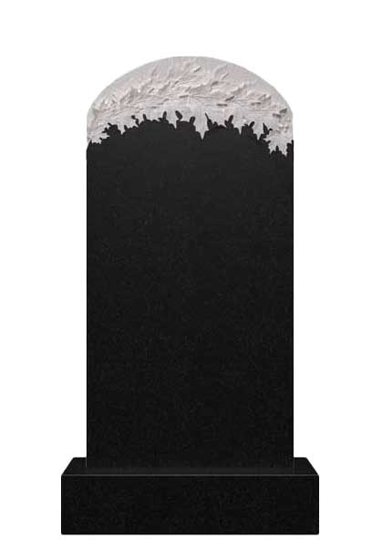 Элегантная вертикальная стела с полукруглым завершением воплощает гармонию традиций и минимализма. Верхняя часть памятника украшена изящным резным орнаментом в виде ветвей с листьями, выполненным методом объемной резьбы. Контраст между полированной черной поверхностью и светлой резьбой создает выразительный визуальный акцент, символизирующий вечную память и связь поколений.