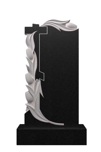 Этот памятник элегантное сочетание духовной символики и утончённого художественного оформления. Модель выполнена из чёрного гранита с полированной поверхностью, на которой высечен православный крест и изящный растительный орнамент по левой стороне цветы тюльпаны. Все резные элементы выполнены на единой плите методом объёмного высечения, что обеспечивает монолитность конструкции и долговечность мемориала.
