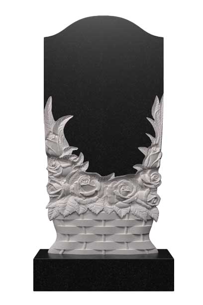 Элегантный вертикальный памятник из чёрного гранита (габбро-диабаз) с арочным завершением. Основное украшение монумента - объёмная резная композиция в нижней части стелы: изящная плетёная корзина с пышным букетом роз и листьями.