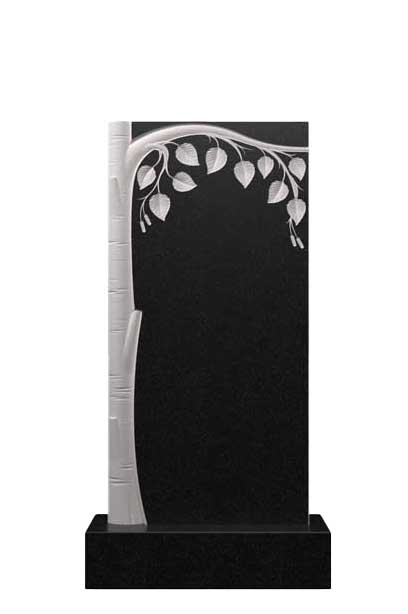 Модель отличается строгой прямоугольной формой и лаконичным дизайном. Вдоль левой грани проходит объемный резной ствол березы с тщательно проработанной фактурой коры. От верхушки дерева отходит изящная ветвь с листьями и сережками, плавно изгибающаяся по верхнему краю стелы. Светлый матовый рельеф создает выразительный контраст с глубоким черным полированным фоном, символизируя чистоту, светлую память и связь с родной землей.