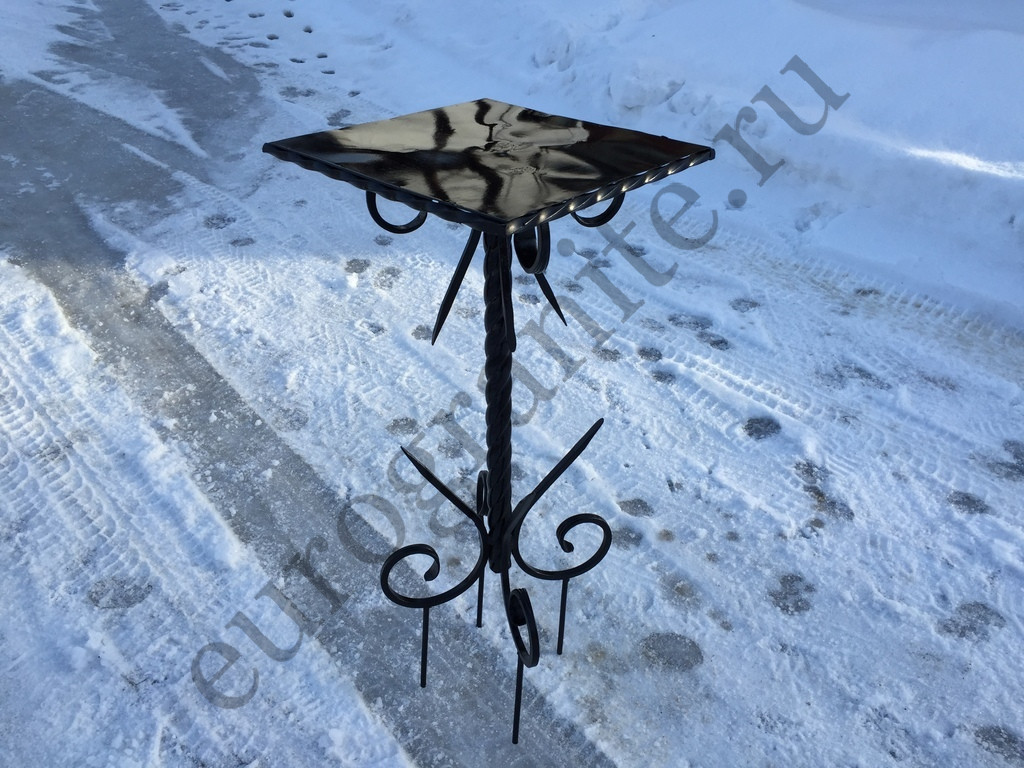 Кованый столик на могилу формы «квадрат» (артикул СМ–49) на одной красивой витой ножке, фиксируемой в фундамент, устанавливается на участках захоронений. Компактный, удобный, износоустойчивый и прочный. Выполняет практическую и эстетическую функцию, украшая мемориальный комплекс на кладбище.